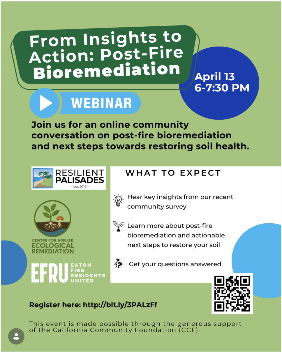 Join Resilient Palisades, @efru.la, and @caer.earth for ‘From Insights to Action: Post-Fire Bioremediation’. This community-focused session will share key findings from our recent survey, break down what bioremediation actually looks like in practice, and walk through what comes next, including resources, opportunities, and ways to get involved.